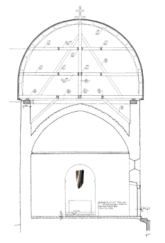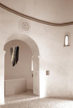 Recalling the tapestry entitled "Mobius Strip' that was made jointly by Miklós Erdely and Gizella Solti (pupil and successor of Noemi Ferenczy and referee of my diploma thesis), as well as the tradition of depicting air and the universe that is present in the history of tapestry also, I wove my work entitled "Time Shape". The soft material of tapestry and its renewed language were themselves suitable for depicting the form of endless time as an endless Mobius strip. I hung the work "Time Shape" in the apse of the historic church at osku as a "spatial textile".